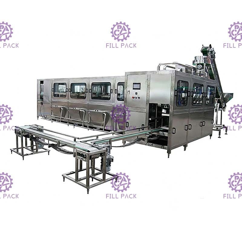 Questo riempitore per galloni produce appositamente acqua potabile in fusti da 3 e 5 galloni. Questa serie di riempitrici per galloni integra lavabottiglie, riempitrice e sigillatrice in un'unica unità.