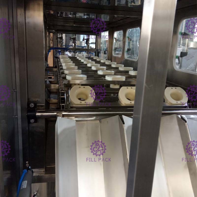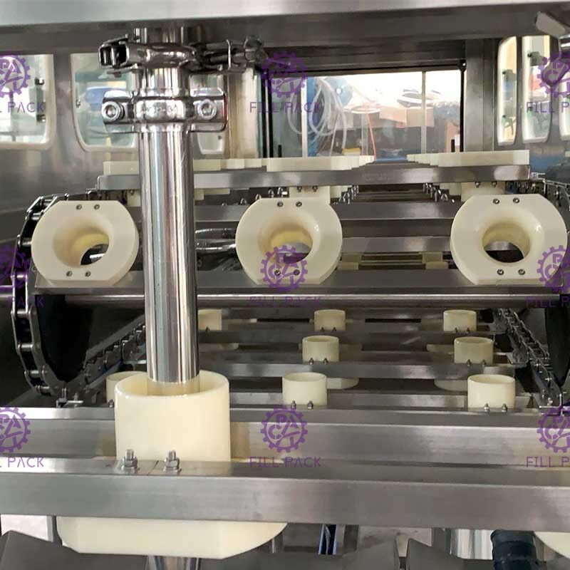 Il secchio pulito viene trasportato dal meccanismo di trasporto della catena e cade sul meccanismo del secchio.e il riempimento è iniziatoIl tempo di riempimento può essere regolato in funzione del flusso della pompa di riempimento.