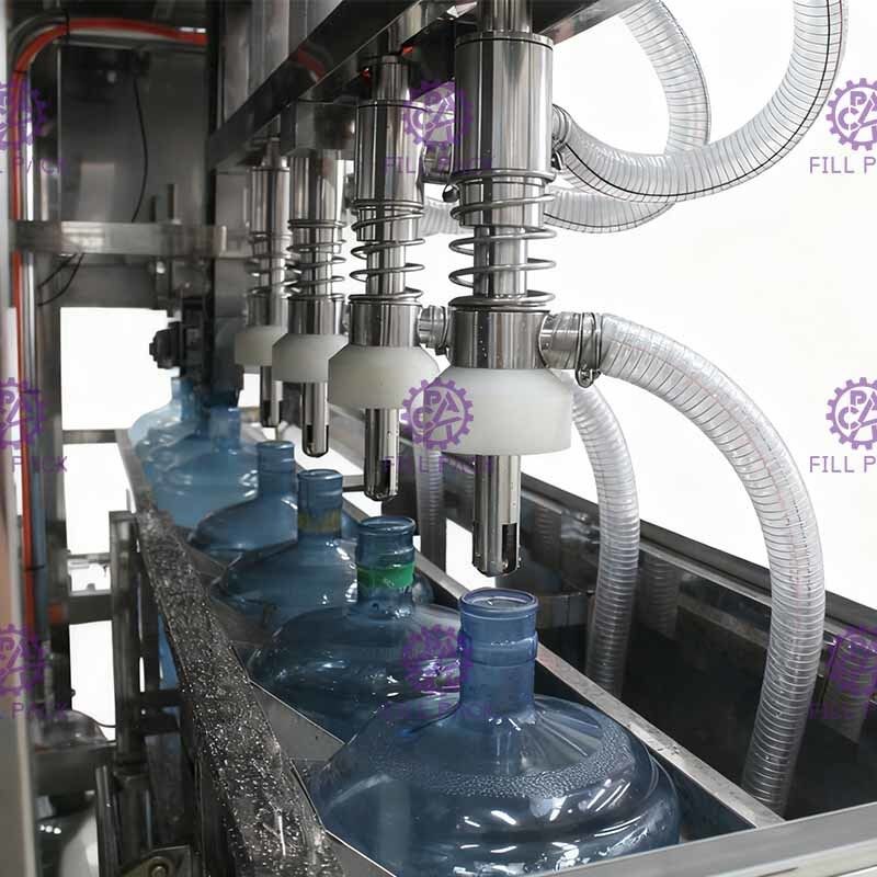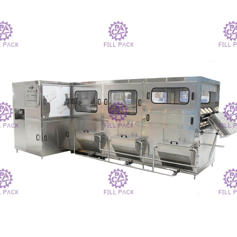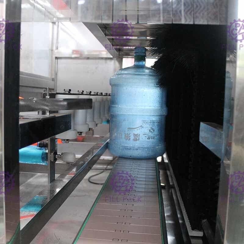 L'intera linea di imbottigliamento dell'acqua da 5 galloni comprende un de-capper automatico, una lavatrice esterna rotativa, una lavatrice/riempitore/capper tipo L, una macchina per ridurre il calore, una luce di controllo, una stampante a getto di inchiostro.