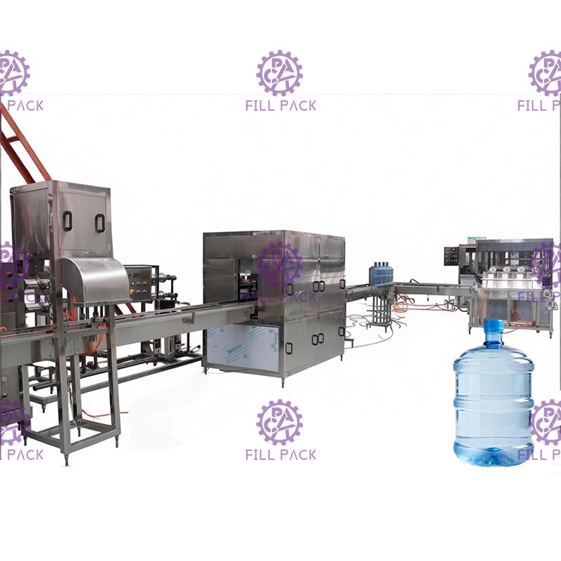 La macchina è completamente bloccata per arrestare la fuoriuscita d'acqua, quando le bottiglie da gallone vengono inviate alla posizione di lavaggio, il cilindro blocca 3 bottiglie all'interno e le fissa con spazzole e barra di fissaggio, l'acqua viene pompata e spruzzata sul corpo della bottiglia, la bottiglia ruota insieme alle spazzole; Le bottiglie vengono pulite dalle spazzole e dalla funzione acqua;